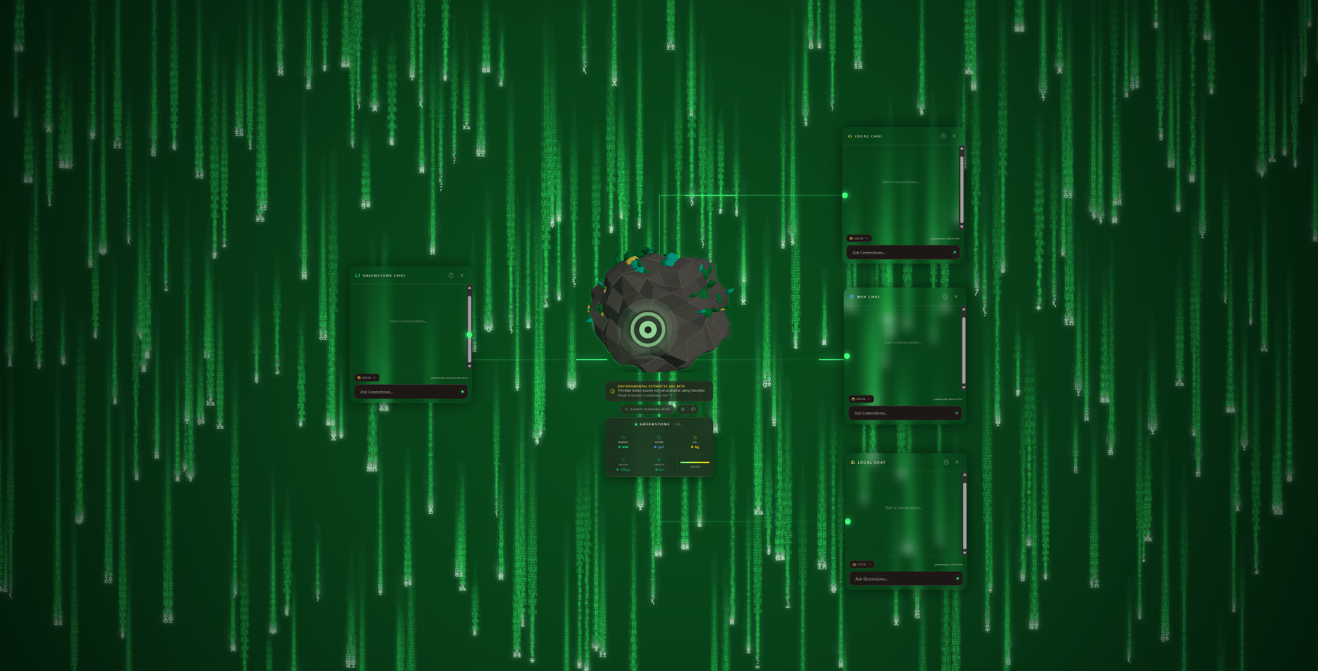 Open as many local, web, or Greenstone chats as you like and connect them with quiet little green wires. Context flows. Tools flow. Automations flow. No dashboards, no noise — just a calm, decentralized mesh of conversations on your own desk.